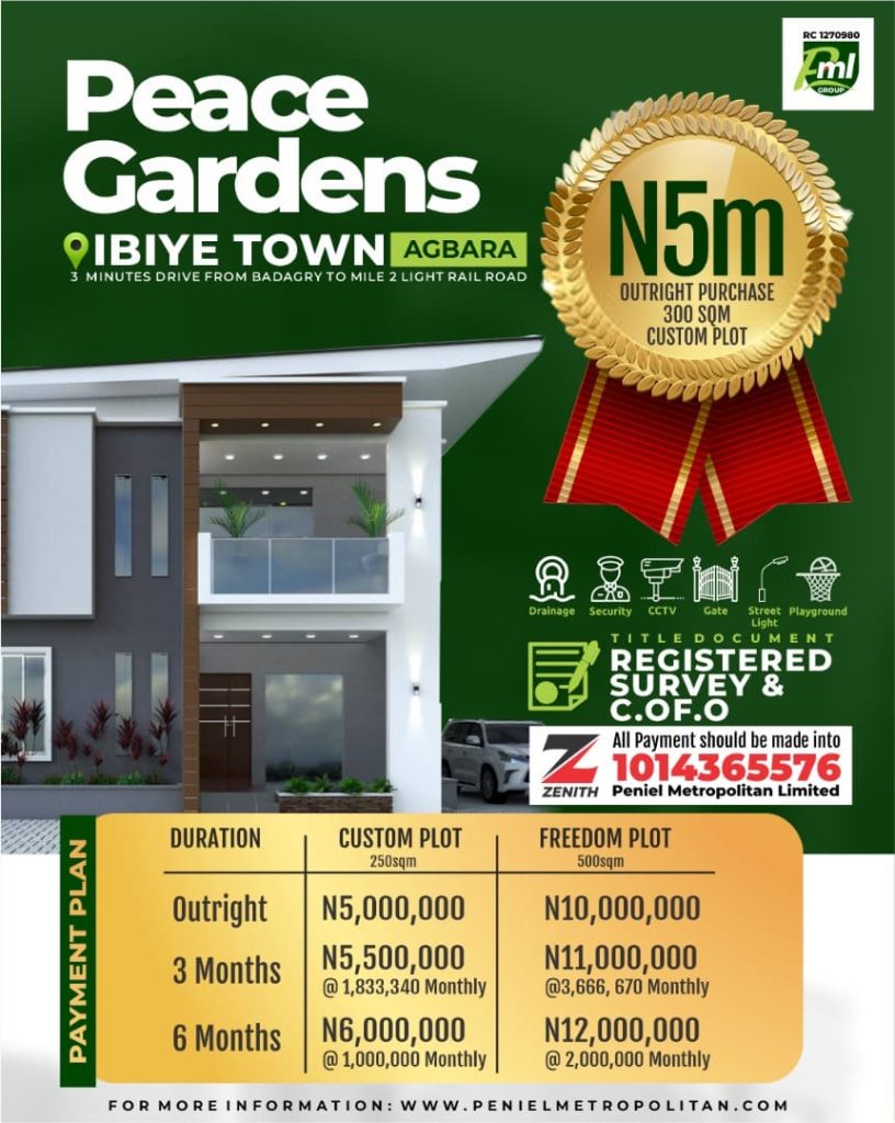 Peace Gardens at Ibiye Town presents a rare opportunity to own property in one of Lagos State’s most promising growth corridors. Situated just minutes from the Badagry–Mile 2 Light Train Road, this estate offers seamless access to transportation networks and commercial hubs while providing a peaceful, family-friendly environment. With its Registered Survey, buyers are assured of a clear title and a smooth, secure acquisition process.