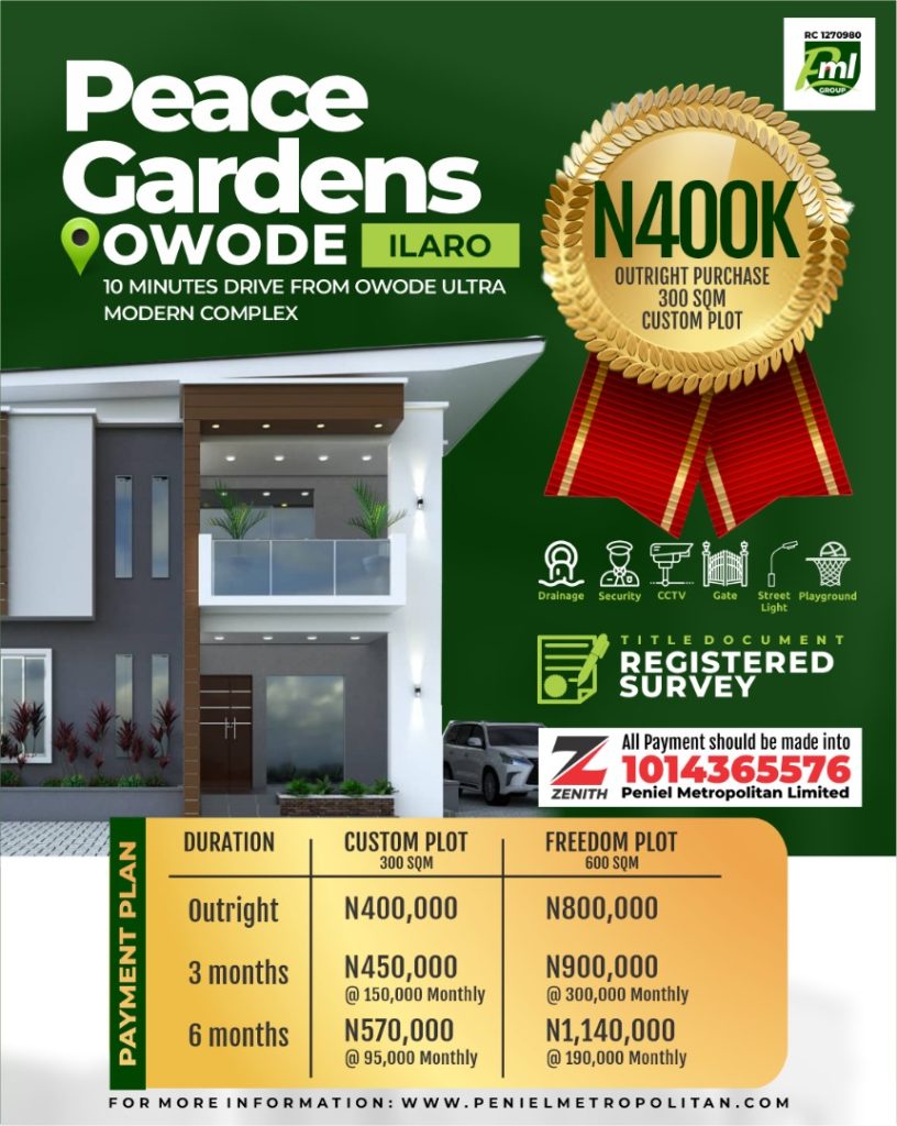 Whether you plan to build now or buy to hold and resell after a year, Peace Gardens offers excellent potential for capital appreciation and a secure return on investment. Don’t miss this chance to own property in one of Ogun State’s most promising areas.